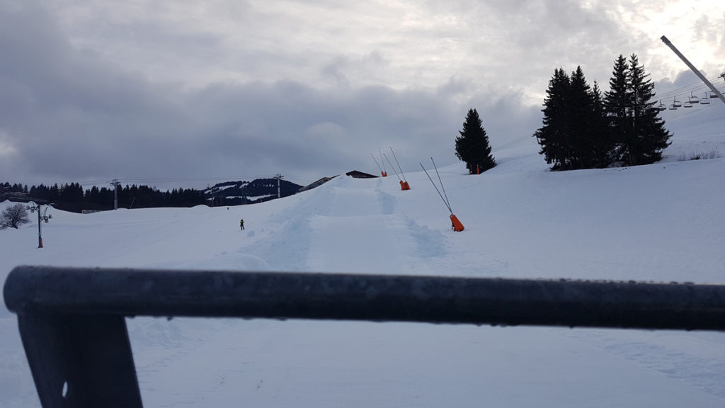 Most of today I spent riding a bucket/cage on the front of a piste basher. Setting up runs, but with no lifts available yet.