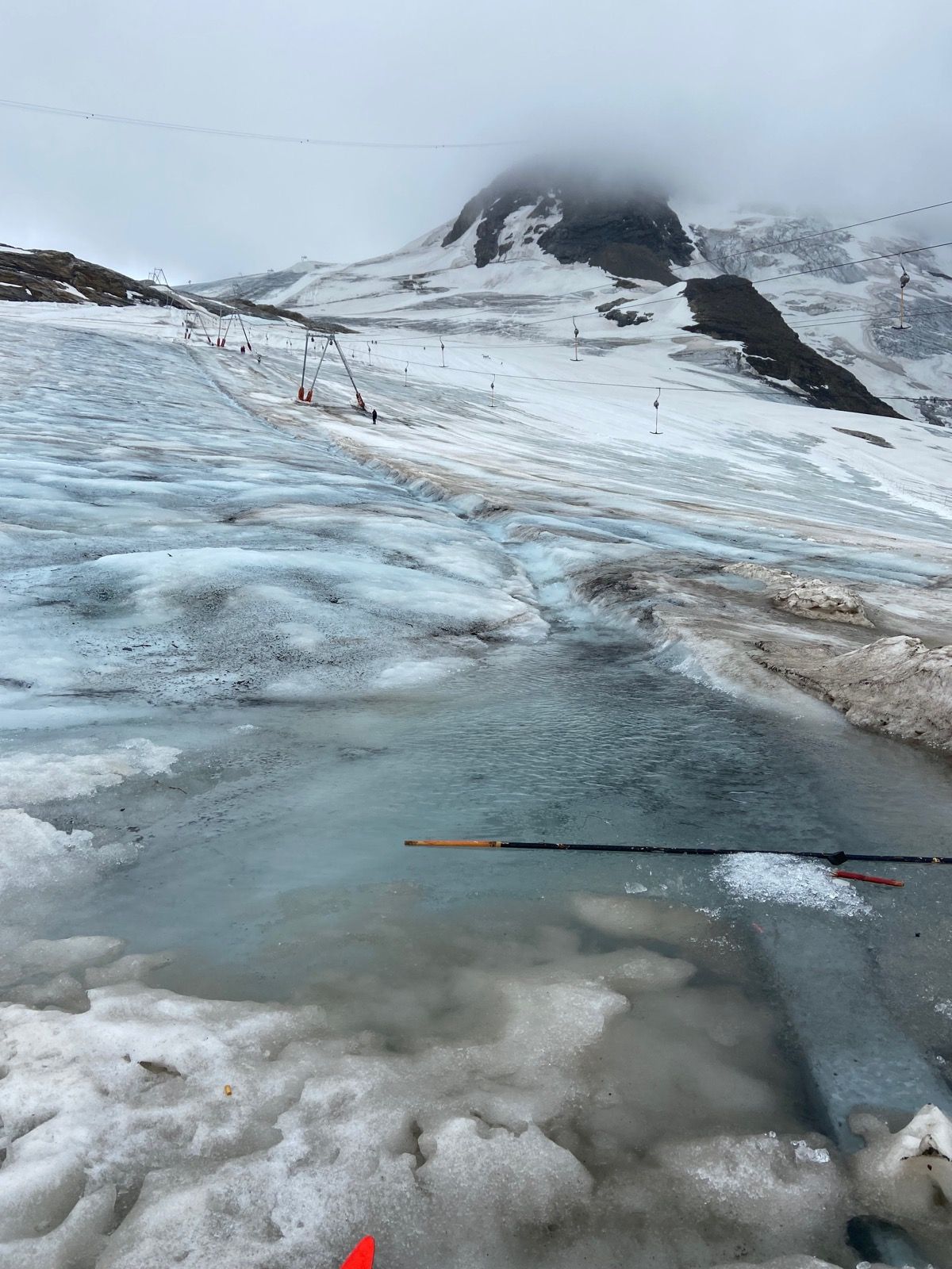 The glacier here was also shut today for high winds, tomorrow too. It is a real mess, with huge holes gushing water on the bottom t-bar. Never seen it like that, you need to be careful not to lose a ski on the way up…