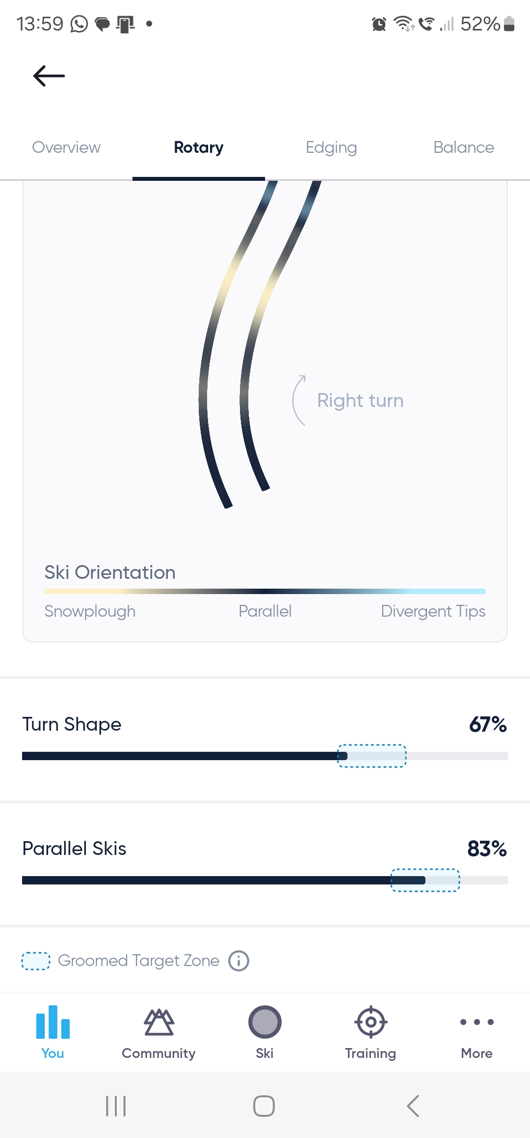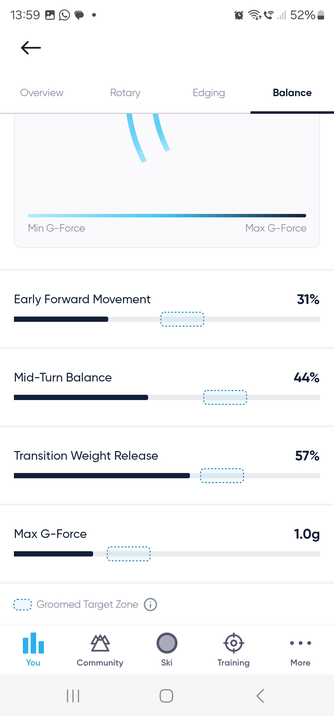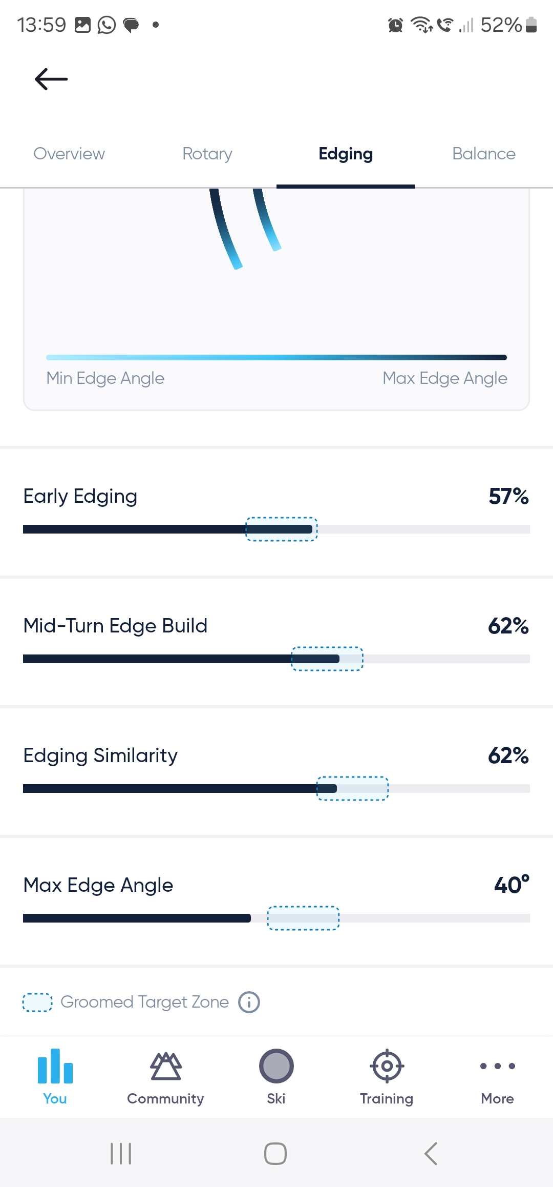 Didn't bother looking at the feedback or trying to improve, as I was just skiing with my daughter for our 1st day of the season. Managed a 136, compared to a revised best of 140 set back in 2019. Hopefully I'll get the chance to go out and try to improve my score over the next week. It will be interesting to strap them to my son when he arrives next week, especially to see how it rates his moguls skiing, as he competes in moguls.