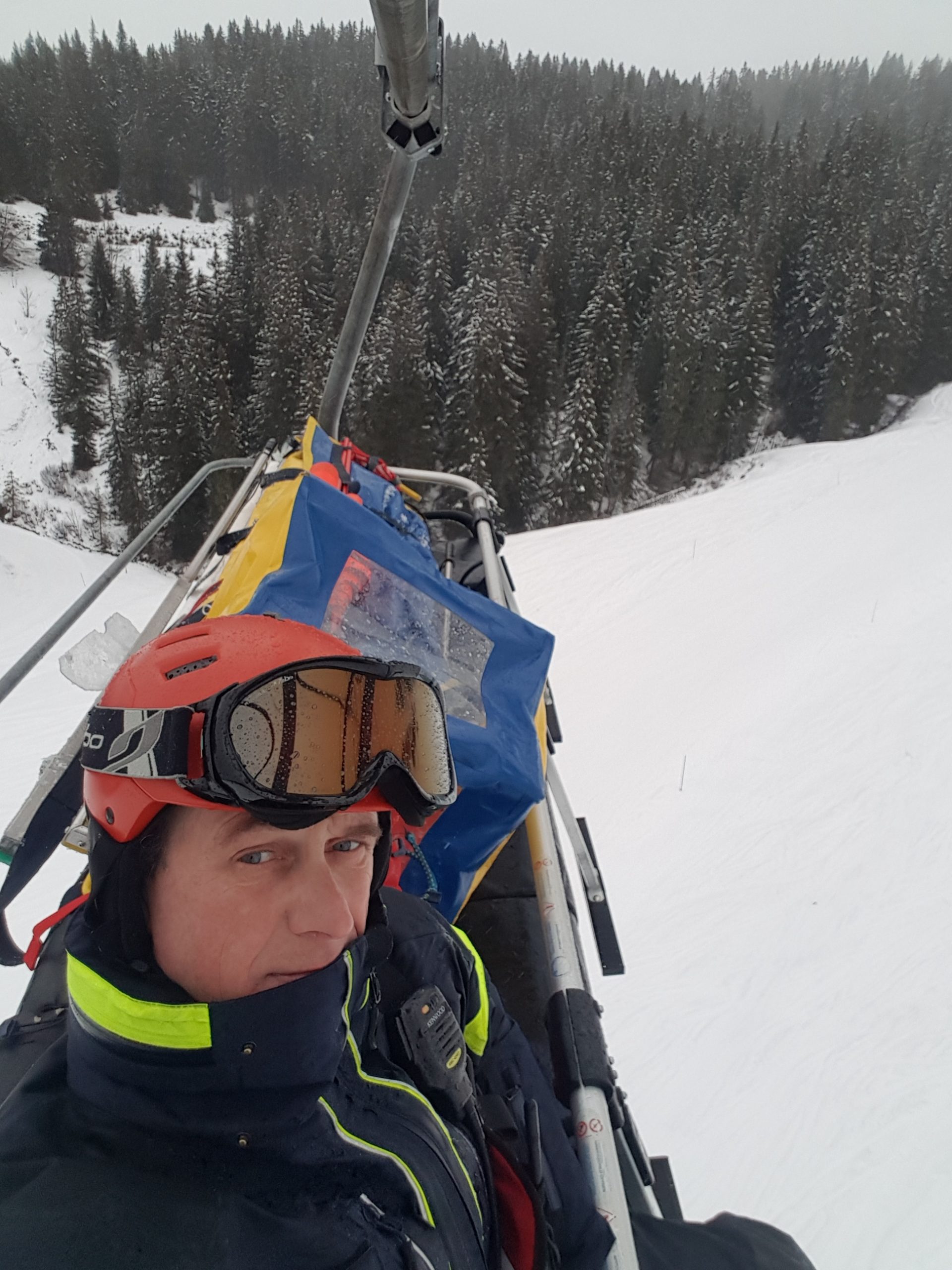 If you ever wonderedd how a rescue sled gets back up the mountain, here is me taking my now empty sled up the Arpette 6 man chair to go back to base. When it is loaded, there is an aluminum cradle that clips into the Chair a bit like a giant version of the iso fix that child seats use in cars. With just enough room (on a 6 man chair) for me to squese in the end.